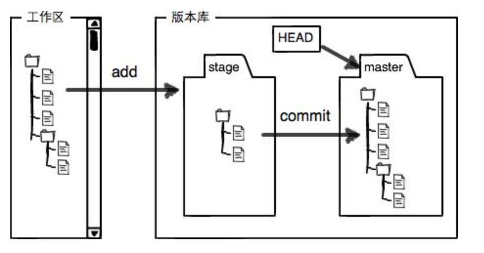 git版本库包含暂存区(stage或index),add从工作区到index,commit从index到分支master